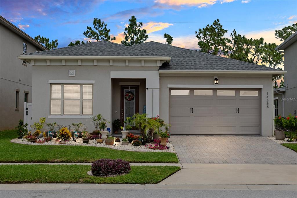 Single-Story POOL home with no rear neighbors offers privacy, style and all the amenities you can imagine making this your forever home. Better than new construction, 4 years young, with upgrades galore, including a Tesla charging outlet capable!!! This home wows from the moment you enter the foyer. You will immediately notice the upgraded glam lighting, easy-care ceramic tile, and neutral gray-tone paint palette. The bright, open gourmet kitchen overlooks the gathering room with dramatic wall mounted vent hood, designer backsplash, stainless steel appliances including double wall ovens, granite counters, 48” cabinets, pendant and recessed lighting with lots of cabinet storage and counter space. Oversized kitchen island with seating is perfect for entertaining. The adjacent gathering room with triple sliding doors and 72” ceiling fan that open to the pool lanai offers easy flow for indoor-outdoor living. Continuing through the open concept floor plan you will truly appreciate the exquisite Owner’s Suite with tray ceiling and electric room darkening shades in the bedroom and enormous walk-in closet with built in storage and natural lighting. Huge Owner’s ensuite with walk in shower, dual sinks, granite counters, under mount sinks, and bright natural lighting. Complete your tour with three additional bedrooms with 4” baseboard and ceiling fans, hall bathroom with granite, under mount sink and walk-in shower plus a nice size laundry room with sink, counter, storage cabinets and shelving. Spend your days outside in the shaded lanai enjoying meals under the covered pavered patio or fun in the sun in your private saltwater pool with waterfall feature that is solar heated. Additional upgrades include a custom-glass front door with keyless entry, wireless alarm system, water conditioner, rain gutters and sprinkler system. When you’re ready to venture out, the community offers resort-style amenities at the community pool with cabana, clubhouse, fitness center and community grills. Conveniently located near restaurants and shopping near highways 528, 408 and 417 for an easy commute to the airport, medical facilities, regional park and more!