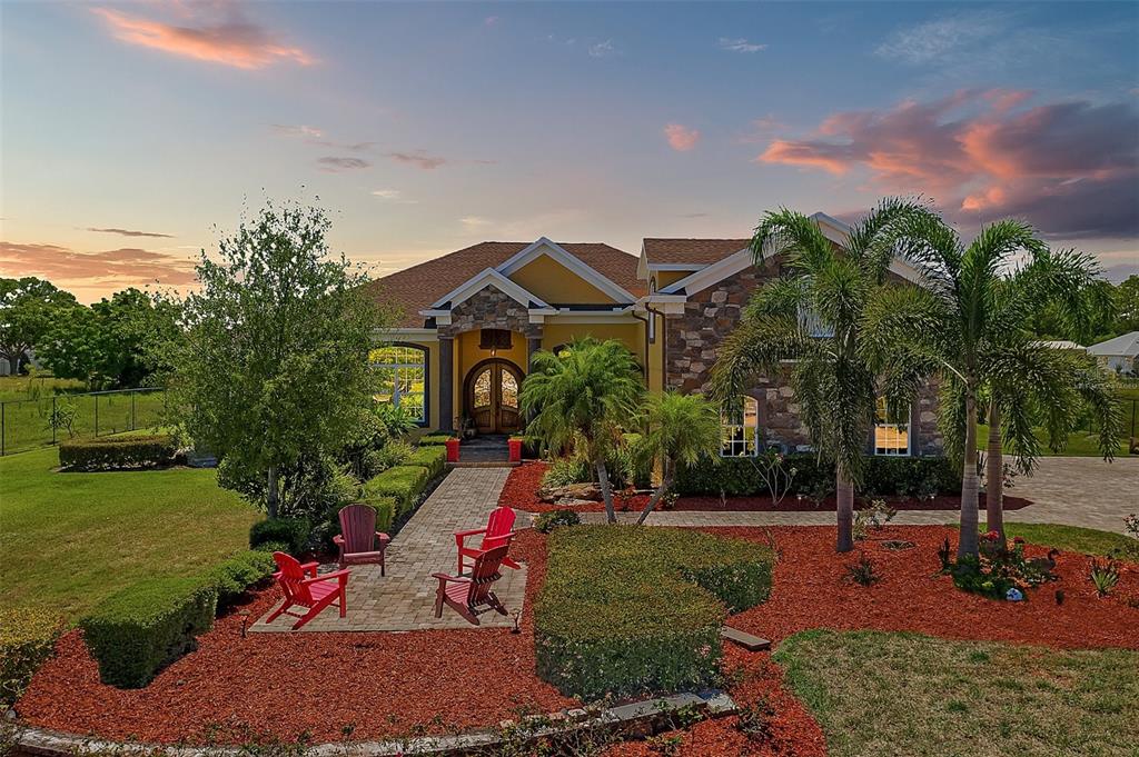 One or more photo(s) has been virtually staged. Welcome home! This extravagant contemporary home is located just minutes from Lake Nona, Disney World's future 60-acre campus, Lake Nona Medical City, Orlando International Airport, Eagle Creek golf course, great schools and more. This stunning one story turn key home sits on just under an acre of land at .93 acres and has 3 bedrooms, 4 full baths, with a bonus room that is located above the 3 car garage. The bonus room is currently the theater room (this room can be turned into a 1/1 studio apartment), an executive office, with hand crafted wood trim throughout and 3050 square feet of living space. The front exterior features a private gate that is controlled by remote or code, mature landscaping with bountiful fruit trees, stone facade, and over $50k in beautiful pavers throughout the entire exterior of the home where you will enjoy many fun weekends and get-togethers. This home is filled with tons of upgrades that you must see to appreciate. The home comes equipped with central vacuum in each room including the hallways. Throughout the home there is travertine flooring and also large windows letting light stream inside for natural illumination. Beautiful hand painted and signed murals give this home a very unique touch. As you enter, you will see the formal dining room and the formal living room with an amazing view of your pool patio. The gourmet kitchen has it all, Gas stove, bar seating, stainless steel appliances, 42” cabinets, and granite counter tops. Right off the kitchen is the living room that features Coffered ceilings and an electric brick fireplace. The primary suite is positioned on the left-wing of the home, giving you plenty of privacy, with its own sitting room that opens to the back patio. You will also find double walk-in closets, dual sink vanities, a jacuzzi tub, a separate tiled walk-in shower, and a water closet. On the right-wing of the home, you will find 2 more bedrooms with a jack & jill full bath and a small walk up to the theater room. The laundry room provides plenty of extra storage space and connects off the garage for convenience. This home is extremely energy efficient with 2 tankless water heaters and double pane windows that are tinted. The star of this home is the extra large covered patio that is covered in beautiful pavers and stone accents, has an outdoor kitchen, electric fireplace, and of course the breathtaking saltwater pool. Imagine the memories you will create in this space. Additional home features are located in the attachments. Don't miss this opportunity, schedule your appointment today!!!
