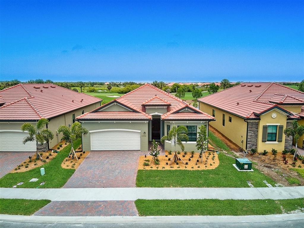 BY FAR THE BEST DEAL IN SARASOTA NATIONAL! If you are looking for a spectacular BRAND NEW HOME that has never been lived in, look no further than this 2022 built Angelina model located in the highly sought after guard gated community of Sarasota National. This home comes with 2 GOLF MEMBERSHIPS that are included in your monthly HOA FEE and NO extra buy-in fees are required. Located on a premium lot that provides sweeping water and golf course views, you will know you are in paradise as you bird watch from your oversized lanai without another rooftop in sight. Just completed in May of 2022, the entire house has IMPACT GLASS WINDOWS and the sliders come equipped with Kevlar Hurricane Screens. Inside you will find upgraded wood tile plank flooring throughout the main living areas, 8 foot interior doors, upgraded interior paint, and beautiful crown moldings. The Angelina floor plan offers one of the most desirable kitchen layouts with its massive island that is perfect for entertaining and everyday living, and a convenient pass-through window that makes serving while you dine alfresco a breeze. The kitchen was upgraded at the time of construction to include 42” custom style cabinetry, granite countertops, travertine backsplash, under cabinet lighting, and built-in stainless steel appliances. The open concept floor plan allows you to enjoy water and preserve views from every angle as you move through the main living space. The owner's retreat is large on space and flooded with light thanks to a wall of windows and a large slider to the lanai. The spa like owner's bathroom features dual sinks, deep soaker tub, and walk-in shower, as well as 2 large closets that provide ample storage. Up front you will find a light filled bedroom with bay window, a full bathroom, and a third bedroom that has been upgraded with porcelain tile flooring and can easily be used as an office or den. The pantry and all closets throughout the entire home have been upgraded with wood shelving stained in a rich Kona color. The 2 car garage was upgraded with epoxy floors and keypad entry for easy access. Golf homes in Sarasota National are rarely available, and views like this don't come up very often! This home was purchased as a second home and has never been lived in, so you are purchasing brand new without having to wait a year plus to build. The builder is now sold out of Executive golf homes, so now is your chance to be in before the new season winter months. Start the process of designing your own outdoor oasis NOW, as there is more than enough room to add a POOL! Live like you are on a 5-star vacation with a 30,000sf clubhouse with resort style pool, hot tub, outdoor tiki bar serving food and drinks daily, a coffee house, fine dining restaurant, 7,000sf fitness center with top-of-the-line equipment and classes, day spa, card room, bocce ball, pickle ball, tennis, dog park, playground, event lawn, and 18-hole championship golf course. Sarasota National is a guard gated 2400-acre International Audubon Bird Sanctuary that offers some of the most beautiful water and preserve views in all of Venice. This home is just minutes to the new Atlanta Brave's spring training camp at the CoolToday Park Stadium, as well as the town center of Wellen Park. Explore 3 local beaches and historic downtown Venice, all less than 15 minutes from your front door! CHECK OUT THE 3D TOUR!